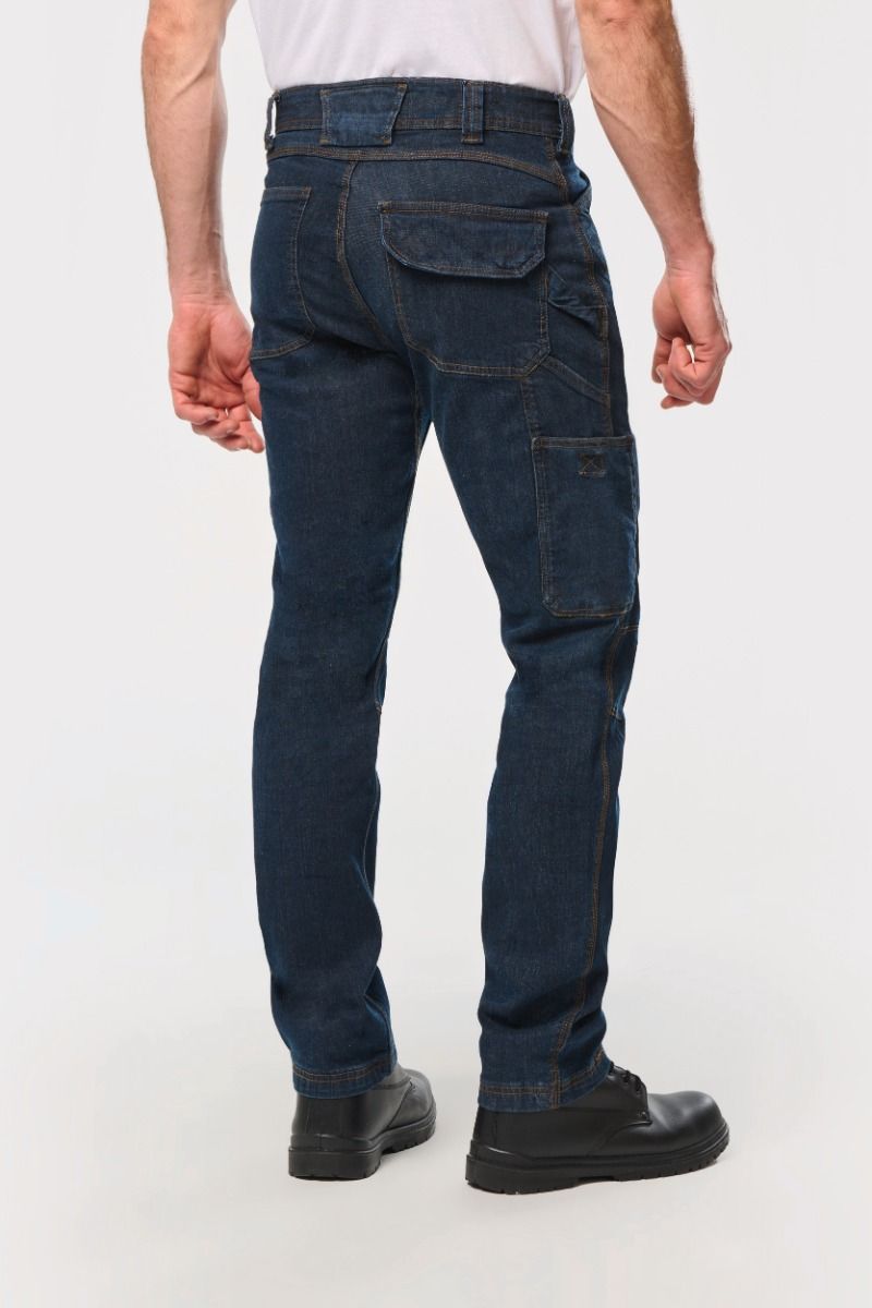 | Omschrijving | 99% katoen / 1% elasthan. Denim. Wasbaar op 60 °C. Fitted pasvorm. Knoopsluiting met knoopklep en metalen rits. Aan de voorkant: 2 zakken met schuine opening. Linkerkant: zak met verstevigende naad en klep met klittenbandsluiting + overzak met 3 vakjes, waarvan 1 met pennenlus. Rechterkant: hamerlus, meterzak + overzak met klittenbandsluiting. Achterkant: 2 opgezette zakken met verstevigende naden, waarvan één met een klep met klittenbandsluiting. Afgeronde tailleband aan de achterkant met brede, elastische en antislip-binnenband voor optimale ondersteuning. Oranje gesp aan de binnenkant in het midden op de rug. Lussen met verstevigende naden, waaronder een grote midden op de rug en 1 plastic ring aan de voorkant. Ruimteplooien aan de knieën, voor meer comfort. Verstevigde kruisplooi voor extra stevigheid en bewegingsvrijheid. Driedubbele stiksels aan zijkanten, binnenkant been en kruis achteraan. Afwerking met dubbel stiksel onderaan de broekspijp. Tear-away merklabel. |